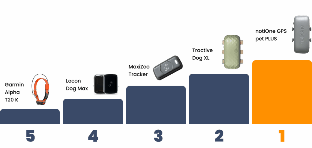 | notiOne GPS pet | Tractive Dog XL | MaxiZoo Tracker | Locon Dog Max | Garmin Alpha T20 K | |